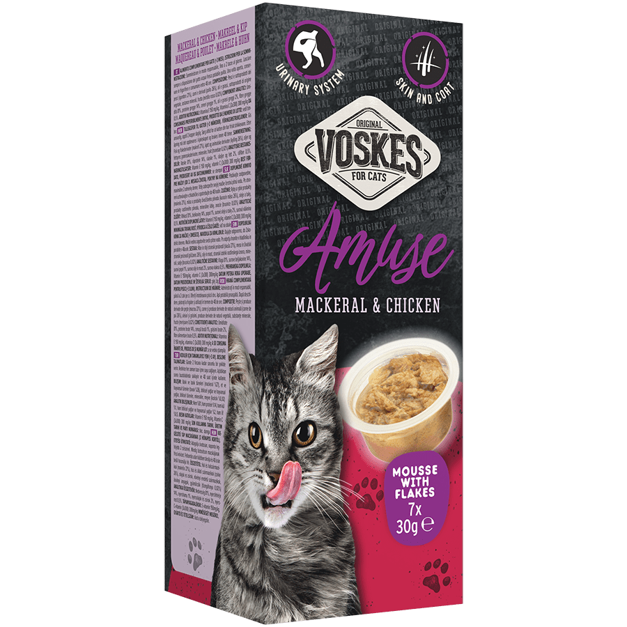 De Voskes Mousse met stukjes makreel en kip is een smakelijke, graanvrije traktatie die speciaal ontwikkeld is om jouw kat verantwoord te verwennen. Dankzij de aanwezigheid van vis, rijk aan omega-vetzuren, ondersteunt deze snack een gezonde huid en een glanzende vacht. De toevoeging van veenbessen ondersteunt de gezondheid van de urinewegen, terwijl antioxidanten bijdragen aan een sterk immuunsysteem. Zo geniet jouw kat niet alleen van een heerlijke traktatie, maar krijgt hij tegelijkertijd een waardevolle ondersteuning voor zijn gezondheid.